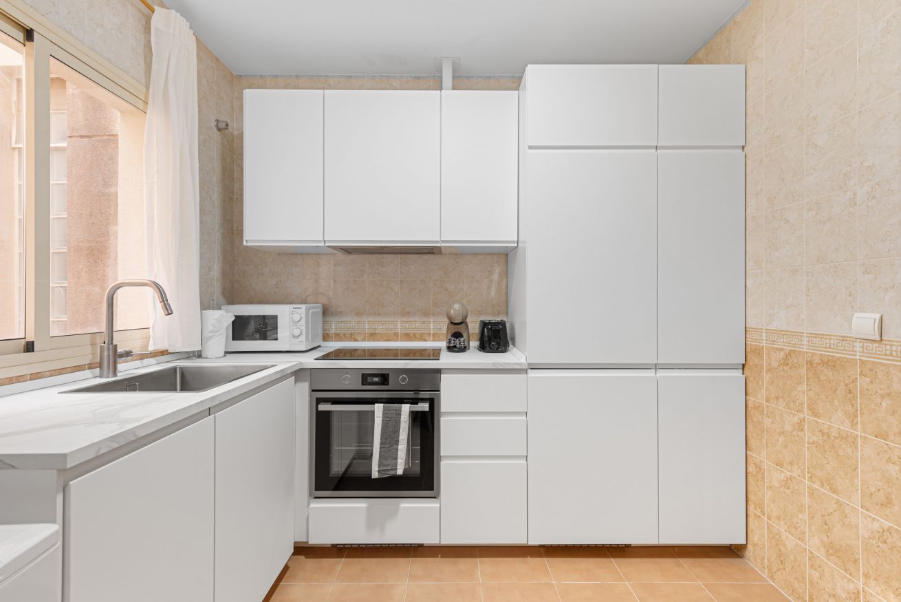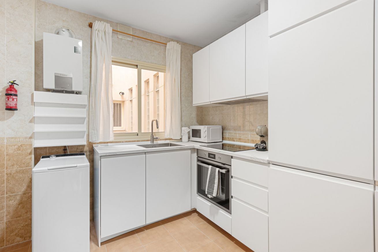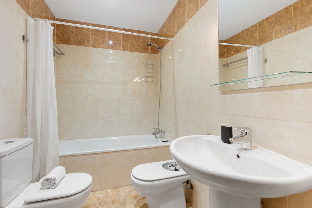La cocina es independiente y está completamente equipada con horno, placa, microondas, cafetera y todo lo necesario para cocinar durante tu estancia. Además, el apartamento ofrece dos baños completos con bañera y ducha, aportando mayor comodidad y funcionalidad para grupos.