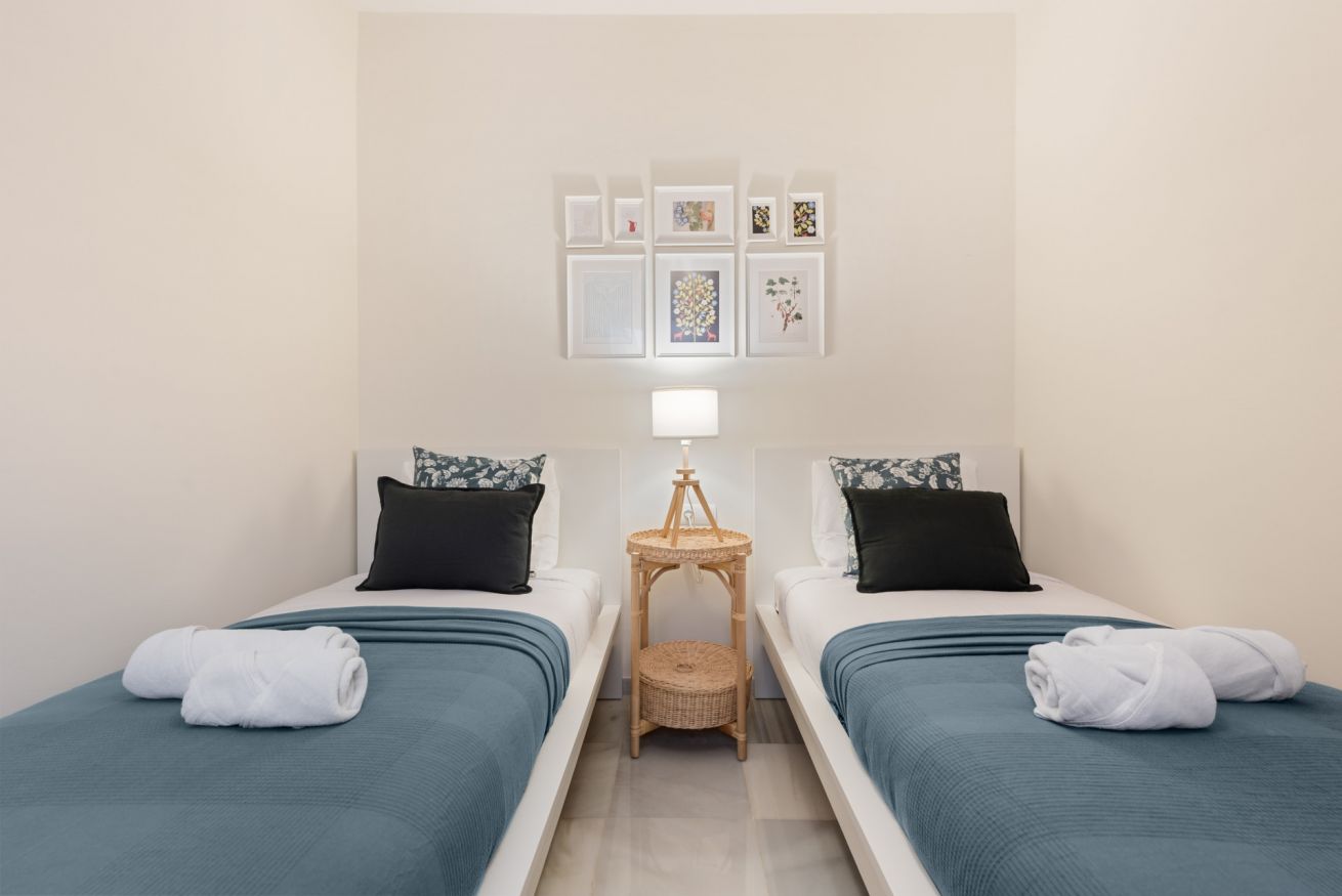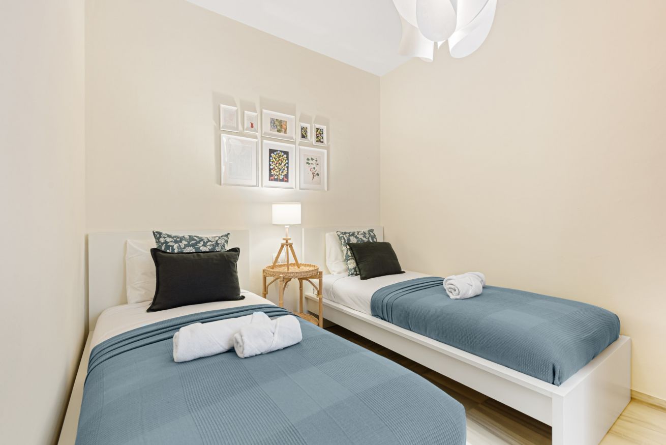 Dispone de 2 habitaciones: una con cómoda cama doble y otra con dos camas individuales, ambas pensadas para garantizar el descanso. La sala de estar cuenta con sofá cama, zona de comedor y un espacio luminoso perfecto para relajarse después de un día descubriendo Málaga.