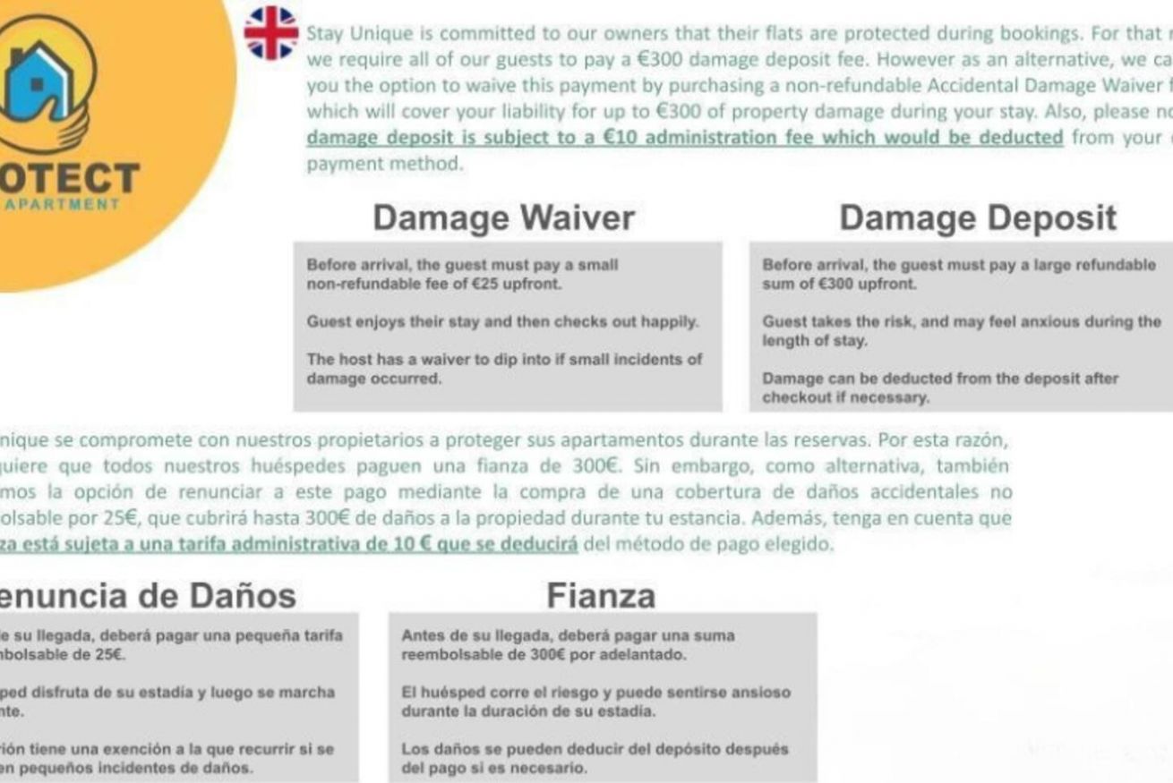 Stay Unique se compromete con nuestros propietarios a proteger sus apartamentos durante las reservas. Por esta razón, se requiere que todos nuestros huéspedes paguen una fianza de 300€. Sin embargo, como alternativa, también ofrecemos la opción de renunciar a este pago mediante la compra de un seguro de daños accidentales no reembolsable por 25€, que cubrirá hasta 300€ de daños a la propiedad durante tu estancia.
