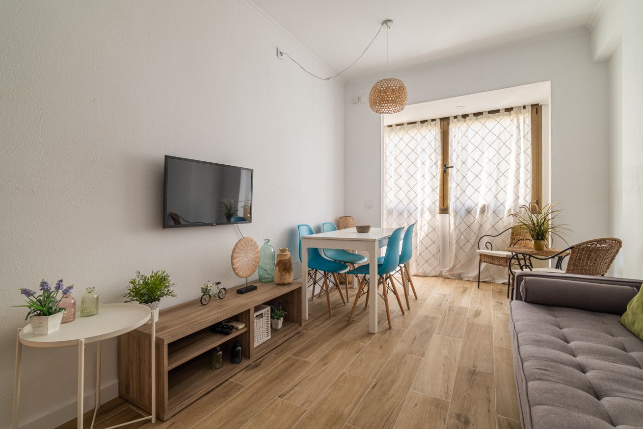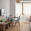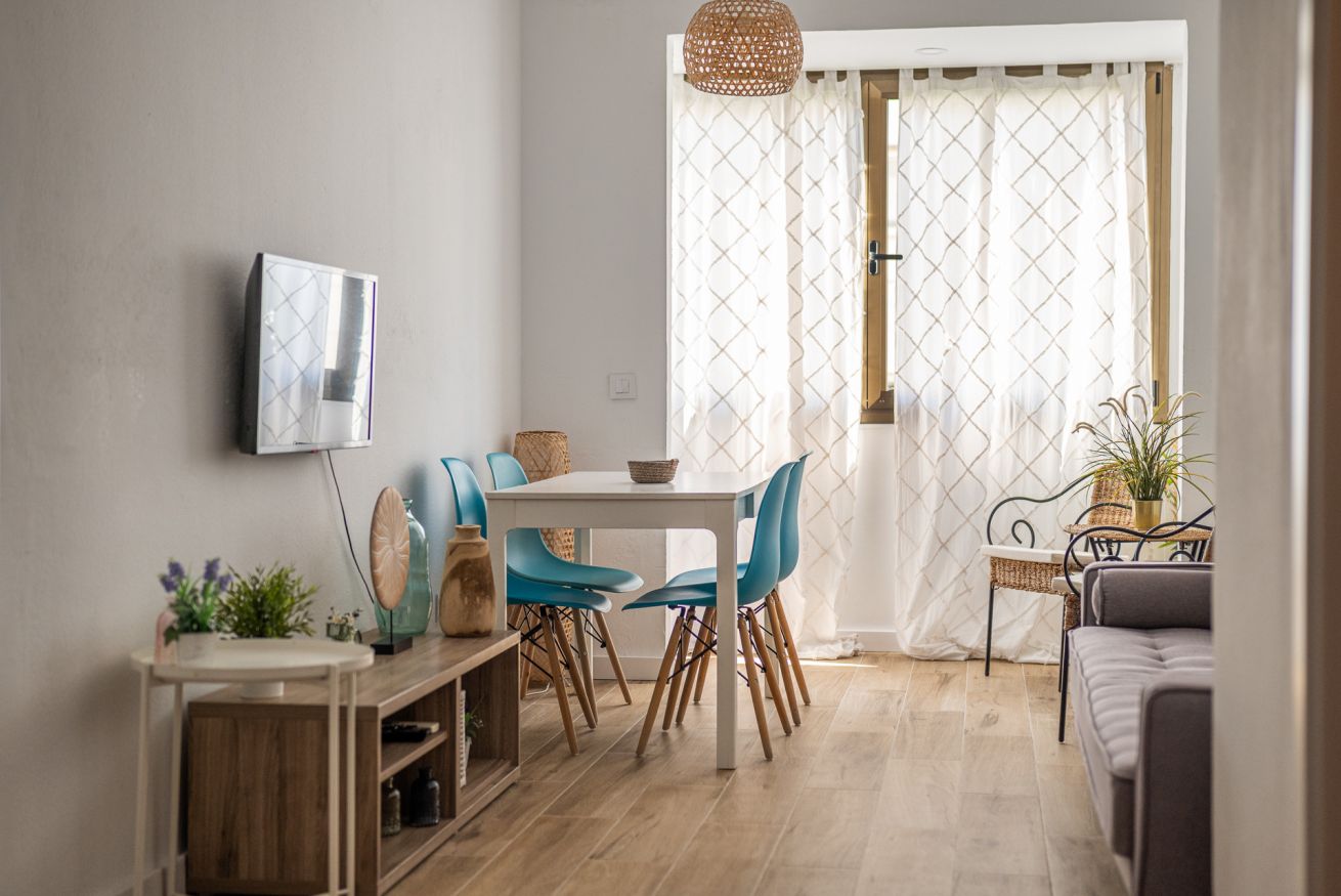 El salón es luminoso con un sofá cómodo, televisor y una mesa de comedor para cuatro personas. Gracias a sus grandes ventanales, el espacio se llena de luz natural durante el día, creando un ambiente cálido y agradable.