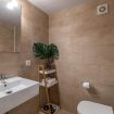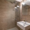 El baño es amplio y está equipado con una ducha tipo lluvia, lavabo, inodoro y detalles en tonos cálidos que aportan un ambiente relajante. También incluye estantería para toallas y artículos de aseo.