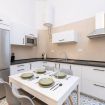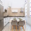 El salón es amplio y cuenta con un sofá cama individual (1,10 x 1,70 m), smartTV y mesa de comedor. La cocina está totalmente equipada con electrodomésticos modernos y menaje completo, ideal para preparar comidas durante la estancia.