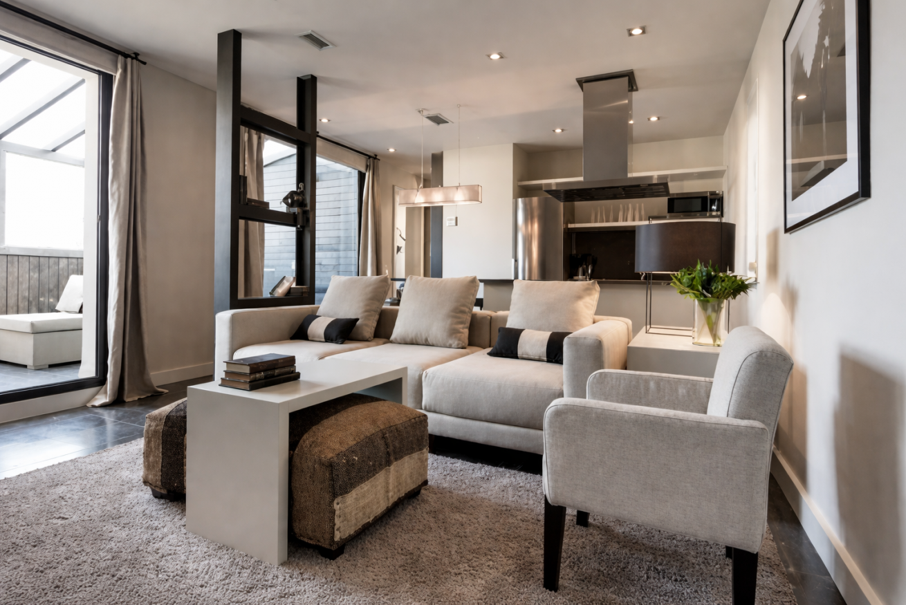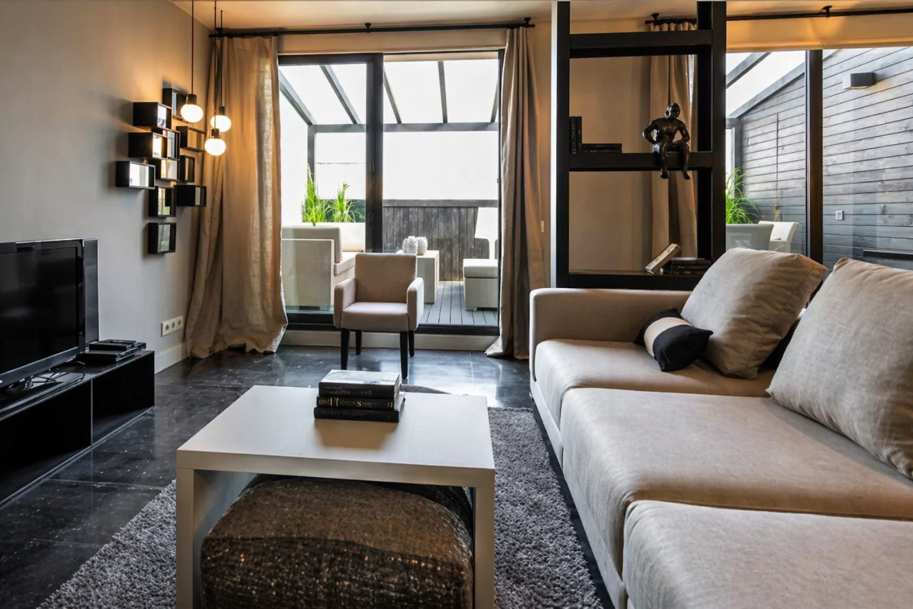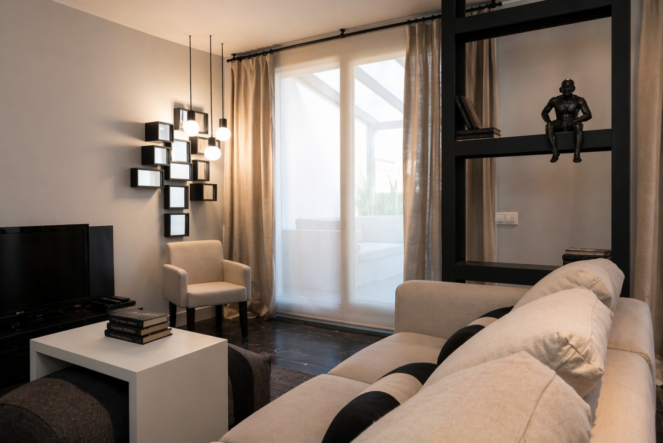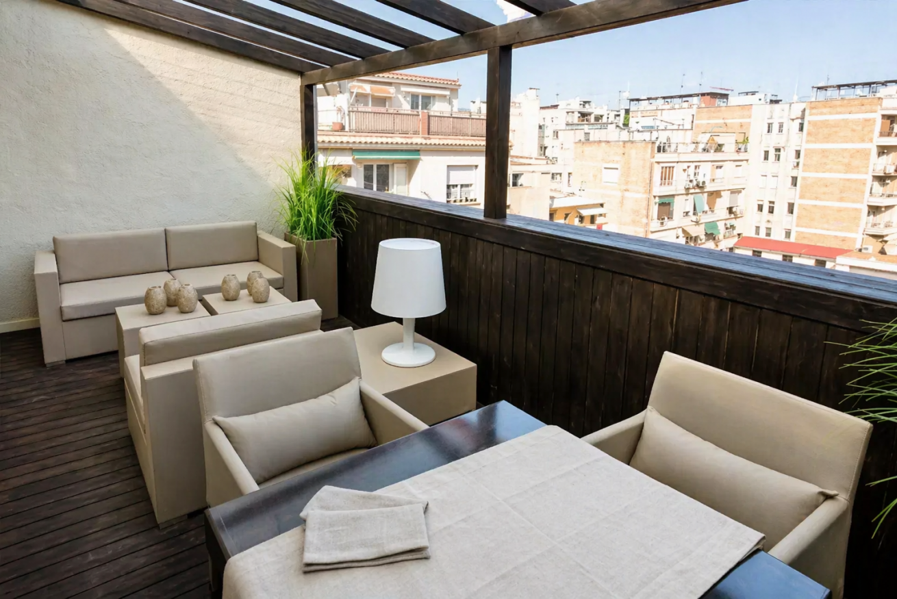 Uno de los principales atractivos del piso es su terraza privada, equipada con sofás de exterior, sillones, mesa de comedor y detalles decorativos como plantas y lámparas. Es el lugar ideal para disfrutar de un café por la mañana, una copa al atardecer o simplemente relajarse con vistas despejadas al barrio.