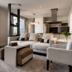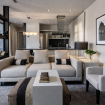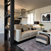 El salón es amplio con un gran sofá cam. Hay una mesa de centro decorativa, sillones adicionales y una original estantería negra que separa visualmente el espacio sin restarle amplitud.