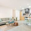 El salón está amueblado con un cómodo sofá, detalles decorativos que aportan calidez y una mesa de comedor ideal para compartir comidas. Grandes ventanales permiten que la luz natural y te dirigen a la terraza privada.