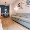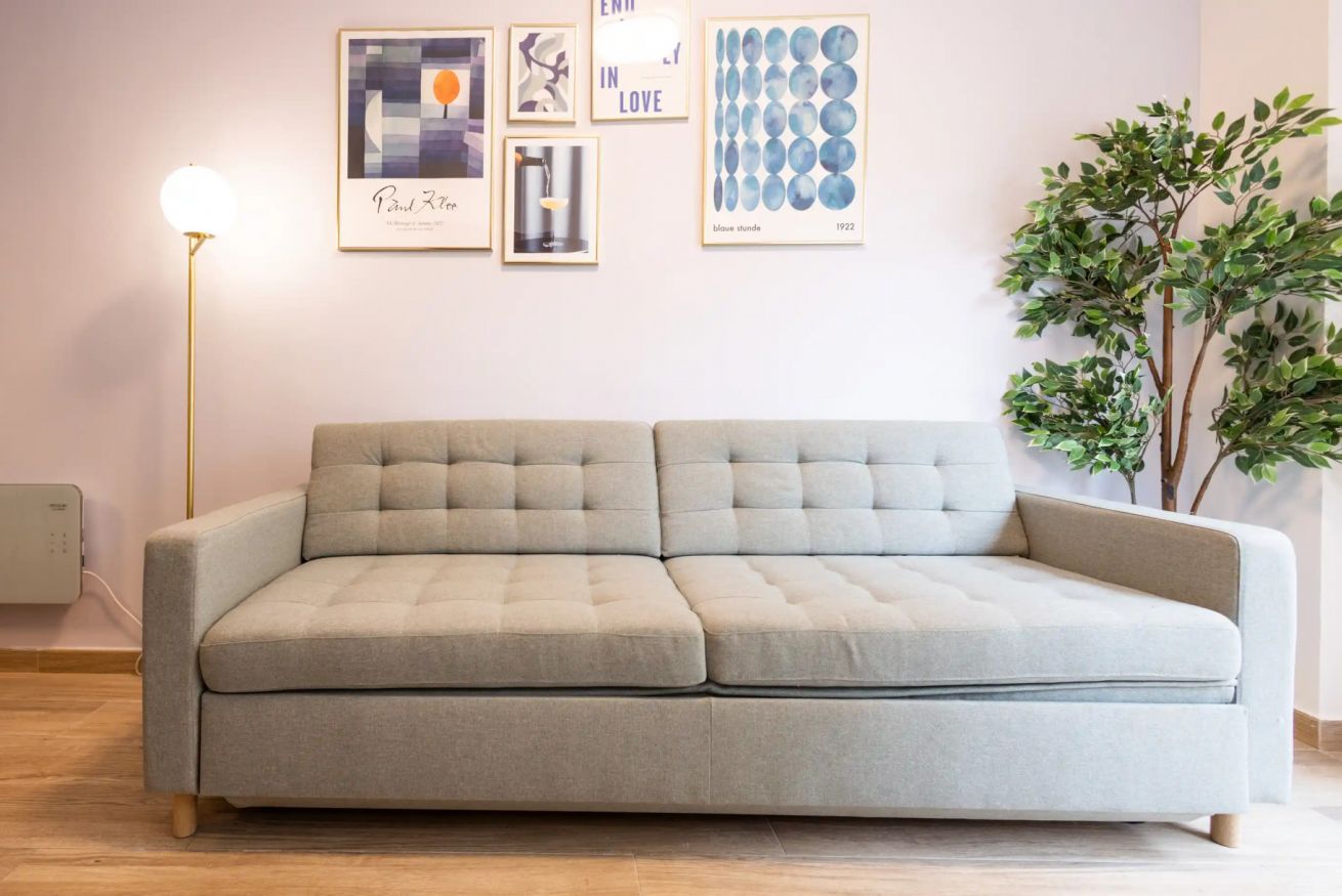 El living, bañado por luz natural, está equipado por un cómodo sofá cama doble y una televisión para momentos de descanso tras un día explorando la ciudad. En este espacio también se encuentra el bello balcón con vistas a la ciudad, ideal para relajarse y disfrutar del vibrante barrio.
