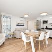 La sala de estar comparte espacio con el comedor y al costado se encuentra la cocina, equipada con lo necesario para preparar deliciosas comidas. Su decoración moderna, con detalles como vidrios decorativos, plantas y cuadros alegres, le agregan estilo y frescura a uno de los espacios favoritos de la casa.