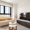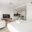 En el estudio se unen la sala de estar y la zona de descanso. Podrá encontrar una cómoda cama matrimonial, con mesas de luz, cuadros decorativos y a pocos metros, un sillón de dos cuerpos con su tv.